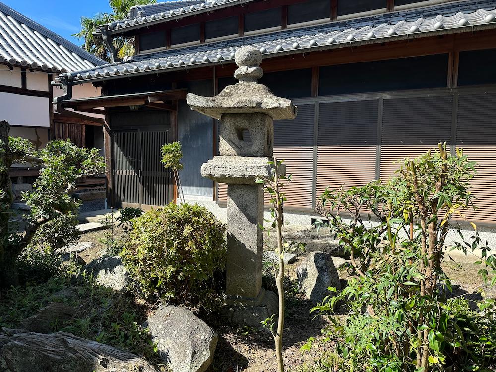 また庫裏の南側に建つ石燈籠は1502年に置始氏の流れを汲む布施(置始)行国という大和武士が寄進したもの。