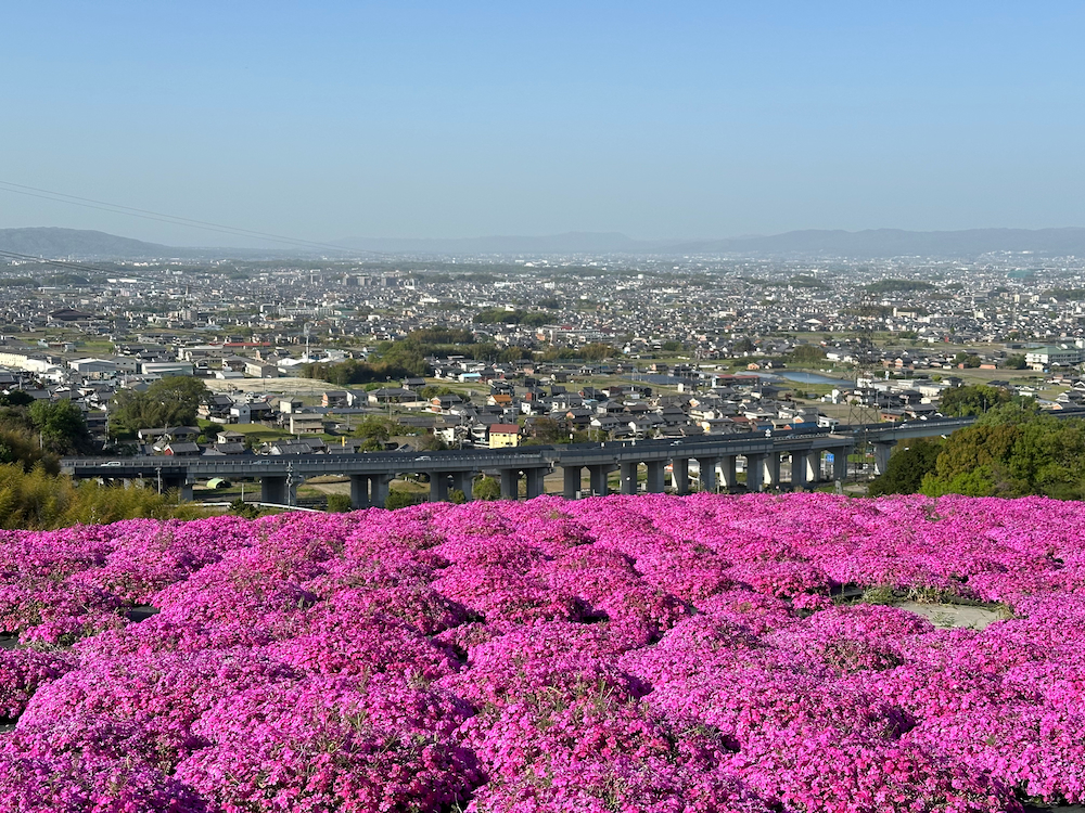頂上では大和平野の絶景が広がります。眼下に芝桜、その先に緑豊かな森、大和平野の町並み、そして大和三山や吉野の山々によるグラデーションが最高!