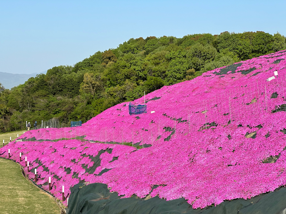奈良県葛城市の道の駅かつらぎの西に位置する「しあわせの森公園」では、4月中旬から5月上旬にかけて北側の法面に芝桜が咲き誇ります。